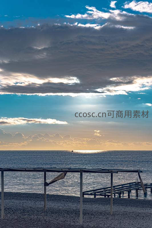 暮色降临,厚重云层间透出金色光芒洒向海面,空旷的栈桥静卧在鹅卵石滩上,远处孤舟点点,尽显苍茫与诗意。