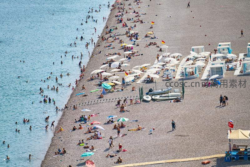 宽阔的砾石海滩上布满五彩遮阳伞与嬉水游客,人们或躺或游,享受着阳光与海水,呈现出一派生机勃勃的夏日景象。