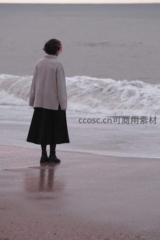 一位女子独自站在海边,凝视着翻滚的海浪,夕阳余晖映照在湿润的沙滩上,营造出宁静而略带忧郁的氛围。