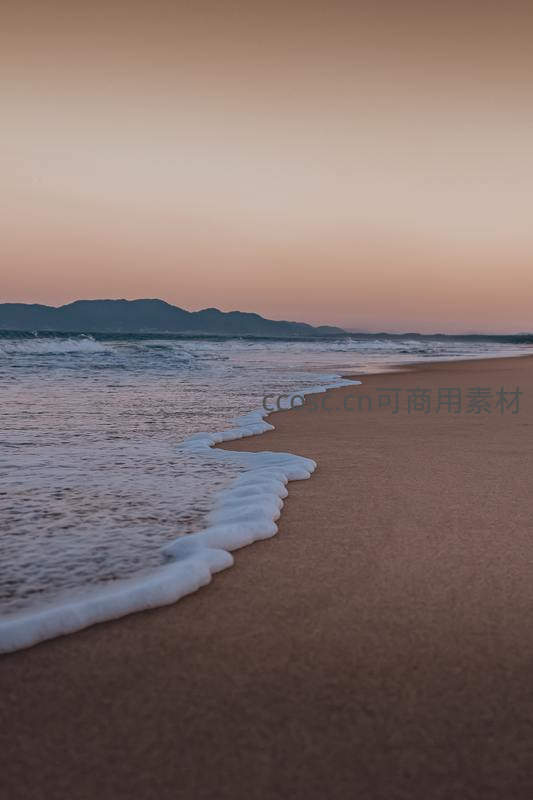 柔和的日落光线洒在平静的海面上,洁白的浪花轻柔地拍打着金色的沙滩,远处的山峦在暮色中若隐若现,景色如画。