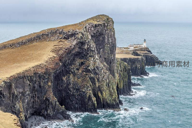 一座白色灯塔矗立在险峻的黑色悬崖之巅,下方是汹涌的碧海,它如同孤独的守望者,在风雨中为过往船只指引方向。