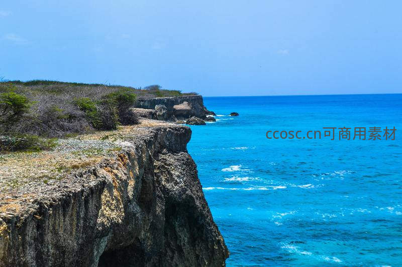 嶙峋的岩石悬崖边缘,生长着稀疏灌木,下方是广阔无垠、色彩层次丰富的蔚蓝大海,阳光明媚,视野开阔,令人心旷神怡。