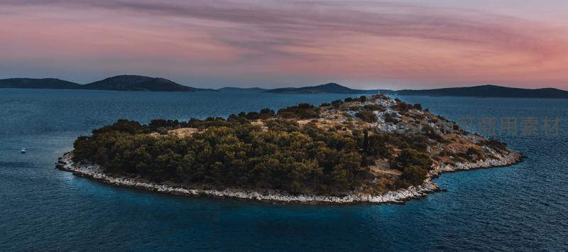 航拍孤岛,暮色中绿意盎然