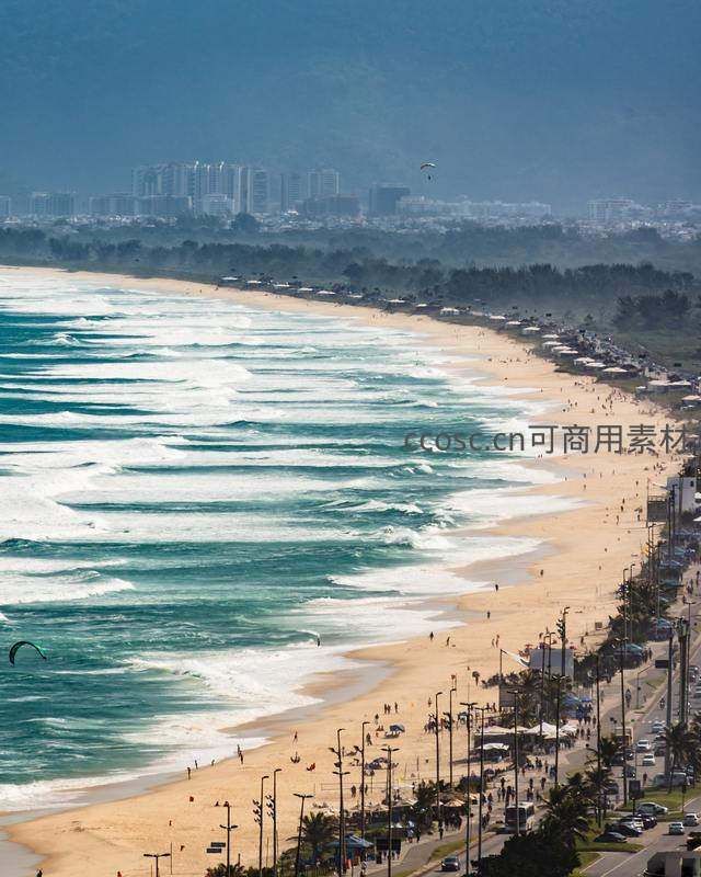 宽阔的金色沙滩上人头攒动,碧蓝海浪翻滚不息,远处现代化都市天际线清晰可见,近处街道车水马龙,展现海滨城市的繁华与活力。