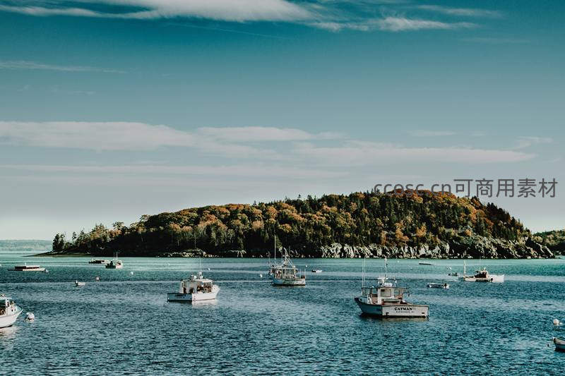 碧蓝海面上数艘渔船静静停泊,远处覆盖着斑斓秋叶的小岛与天空相接,构成一幅宁静的海滨画卷。