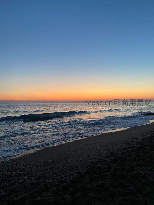 夕阳西下,橙黄与深蓝交织的天空下,温柔的海浪轻抚着幽暗的沙滩,营造出静谧安详的黄昏氛围。