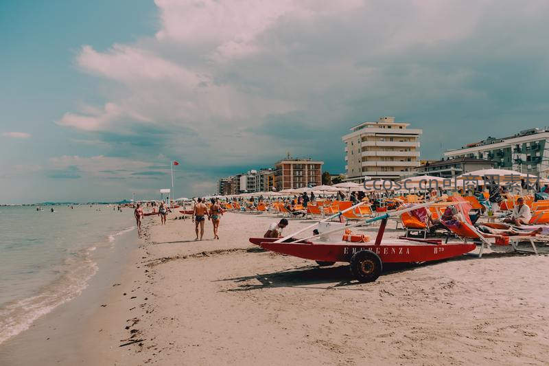阳光明媚的沙滩上,橙色躺椅和白色遮阳伞整齐排列,游客们享受着悠闲时光,远处是滨海建筑群。