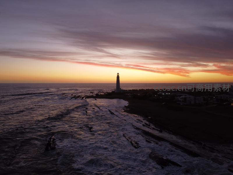 日落时分灯塔剪影映衬绚烂云霞
