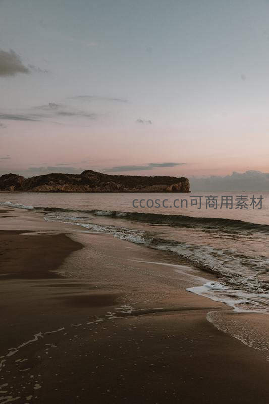 在温柔的暮色中,海浪轻轻拍打着湿润的沙滩,远处的山峦轮廓在粉紫色的天际线下显得格外宁静与安详。
