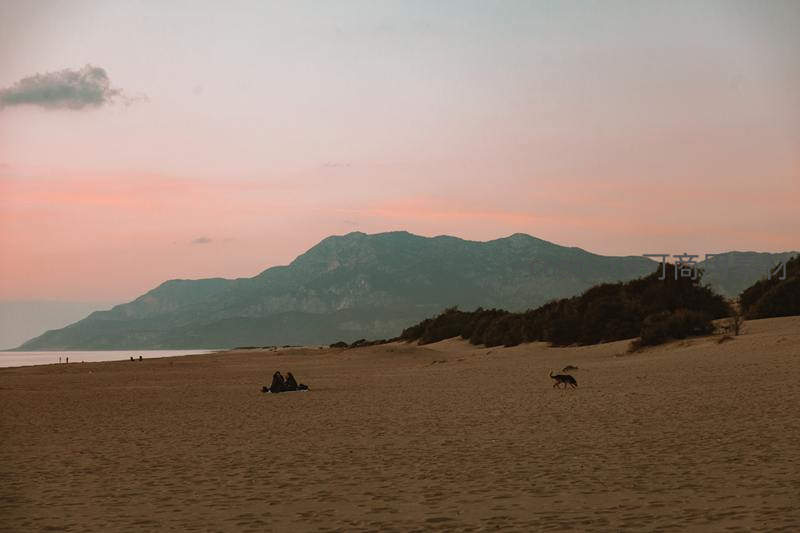 金色沙滩上,游人与小狗在落日余晖中休憩,远处连绵山脉勾勒出宁静的海岸线轮廓。
