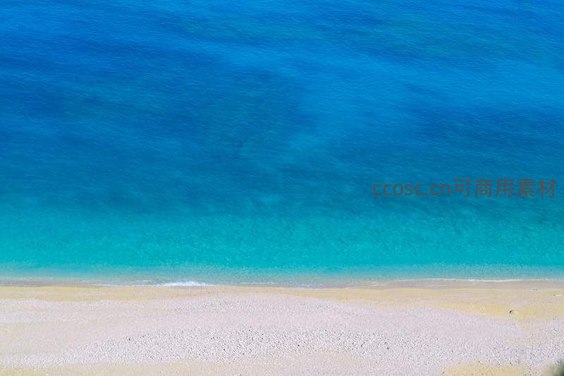 从高空俯瞰,湛蓝海水与洁白沙滩形成鲜明分界,浪花轻抚岸边,展现无垠的热带海岛风情。
