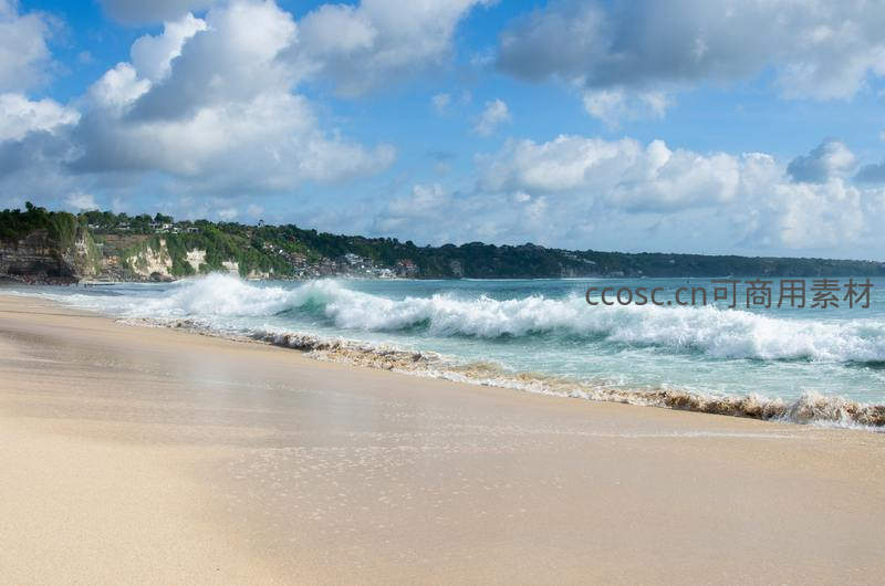 洁白浪花汹涌拍向细腻沙滩,背景是绿树覆盖的悬崖与蔚蓝天空,充满动感与自然之美。