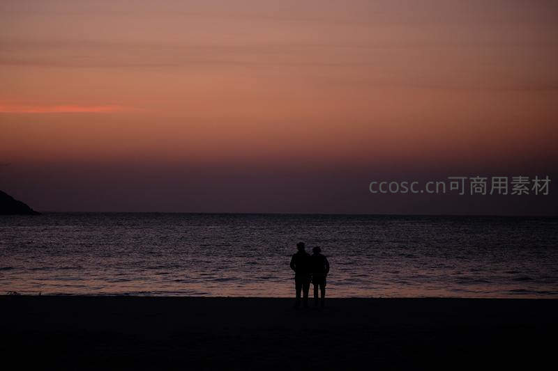 黄昏海边情侣的浪漫剪影