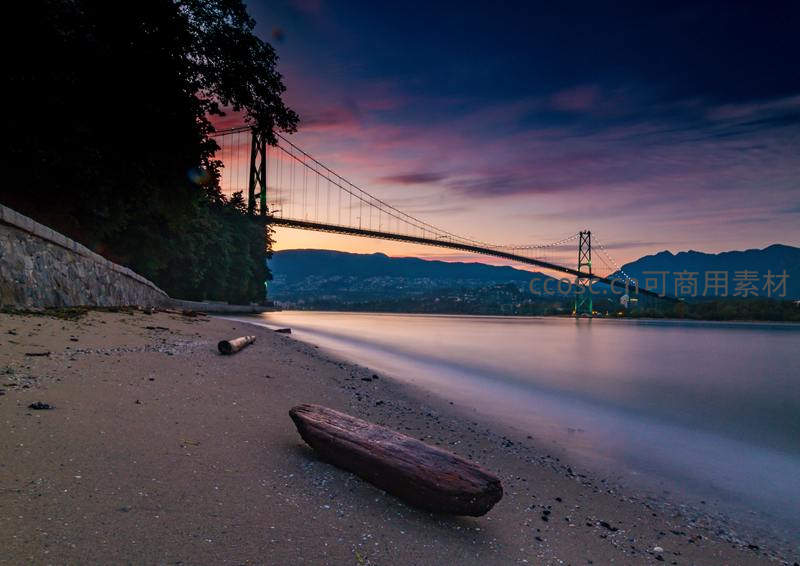 夕阳西下,一座宏伟的悬索桥横跨水面,前景的沙滩和木桩在霞光中显得格外宁静。