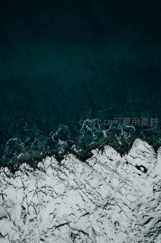 深邃的墨绿色海水拍打着苍白嶙峋的岩石海岸,强烈的色彩对比展现了大自然的力量。