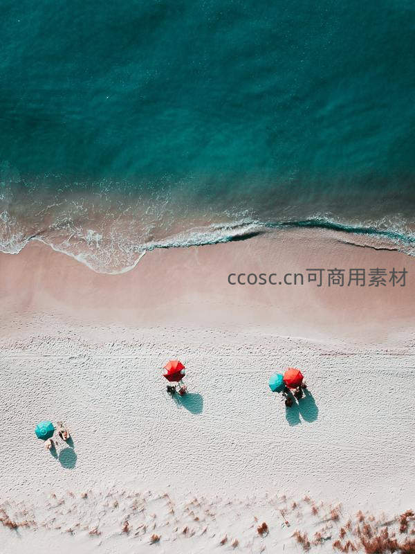 从空中俯视,几把鲜艳的遮阳伞点缀在细腻的白色沙滩上,与碧绿海水和轻柔波浪共同构成一幅悠闲的度假画卷。