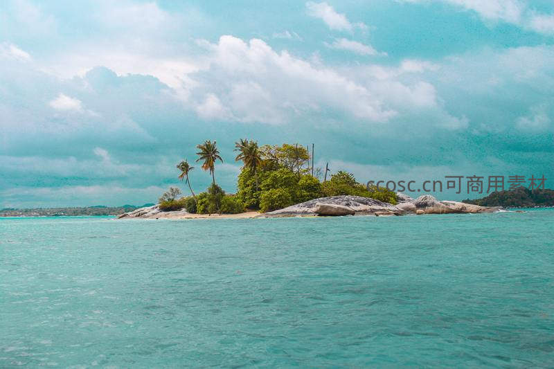 一座布满岩石和绿植的小岛静卧在碧绿的海水中,几棵椰子树随风摇曳,远处云层翻滚,尽显原始自然之美。