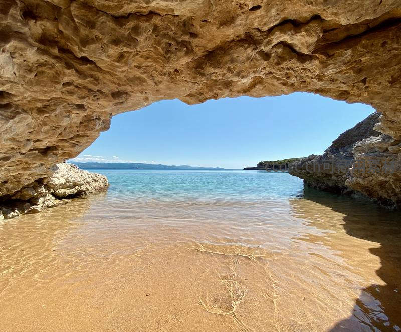 从天然海蚀洞中向外望去,清澈的海水与蔚蓝天空相接,阳光洒在湿润的沙滩上,景色宁静而壮美。