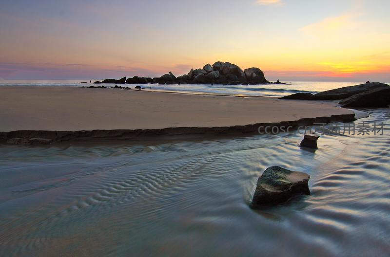夕阳西下,柔和的余晖洒满沙滩,退潮后水面留下细腻的波纹,远处礁石剪影勾勒出诗意的黄昏景象。