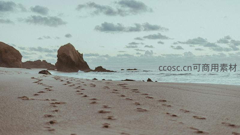 沙滩足迹通向远方岩石海岸
