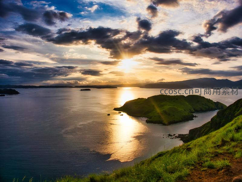 日落时分海岛全景,金色阳光穿透云层洒满海面