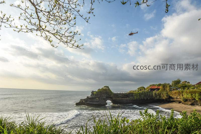 在印尼巴厘岛标志性的海神庙上空,一架直升机划过云层,下方是碧海、古寺和葱郁植被,构成一幅充满动感的文化画卷。