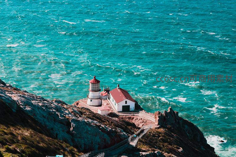 一座红顶白身的灯塔屹立于陡峭的悬崖之上,俯瞰着波涛汹涌的碧蓝大海,为过往船只指引方向,象征着希望与守护。