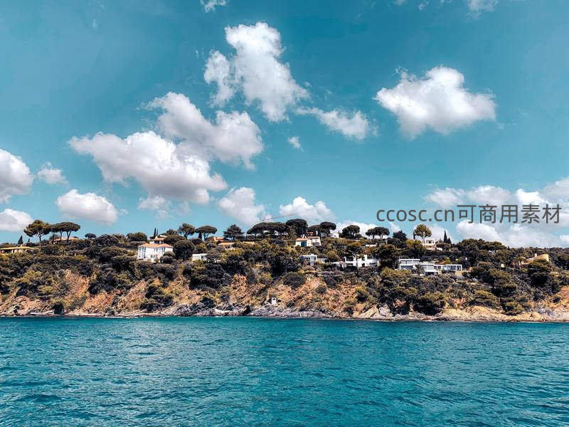 蔚蓝天空下,白色房屋错落有致地坐落在植被覆盖的山崖上,尽显地中海沿岸的宁静与浪漫。