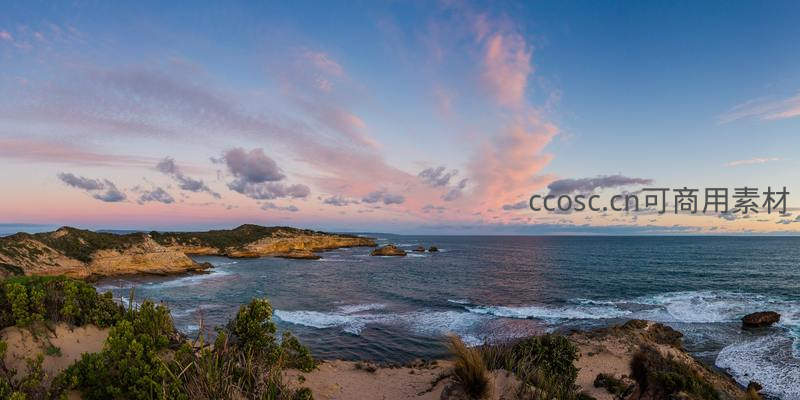 夕阳将云层染成粉紫色,海浪轻拍着崎岖的海岸线,沙丘与灌木点缀前景,景色壮美如画。