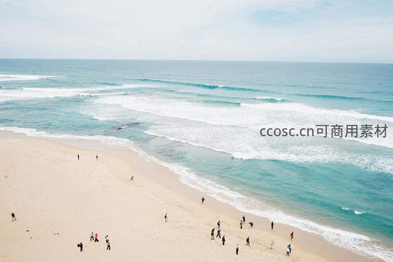 高角度拍摄的宽阔海滩,人们在柔软的沙地上散步或戏水,层层海浪拍打着海岸,充满活力。
