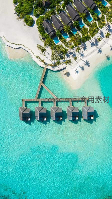 从高空俯瞰马尔代夫的奢华水上别墅群,洁白的沙滩、翠绿的棕榈树与宝石般的碧蓝海水交相辉映,尽显热带海岛度假天堂的魅力。