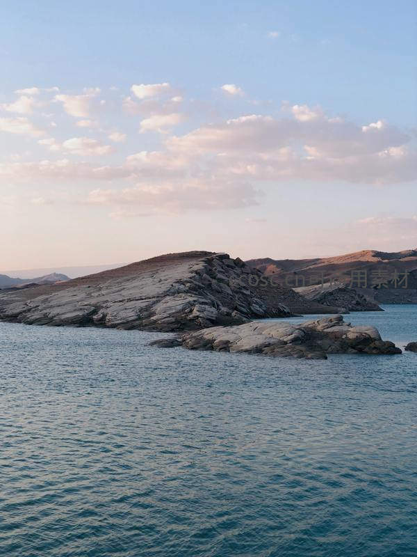 平静的湖面中央,一座由嶙峋岩石构成的孤岛静静伫立,淡粉色的云朵倒映在水中,远处是连绵的山丘,画面宁静而悠远。