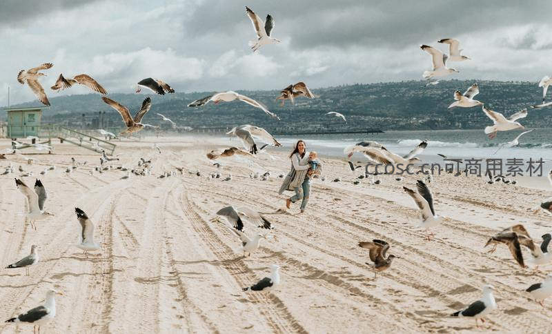 一位母亲抱着孩子在沙滩上快乐奔跑,周围成群的海鸥振翅飞翔,背景是阴云密布的天空和远处的海岸线,充满动感与生活气息。