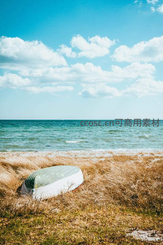 一艘白色小船静静地停泊在金黄色的海滩草丛中,前方是无垠的蔚蓝大海和点缀着朵朵白云的晴朗天空,氛围宁静而惬意。