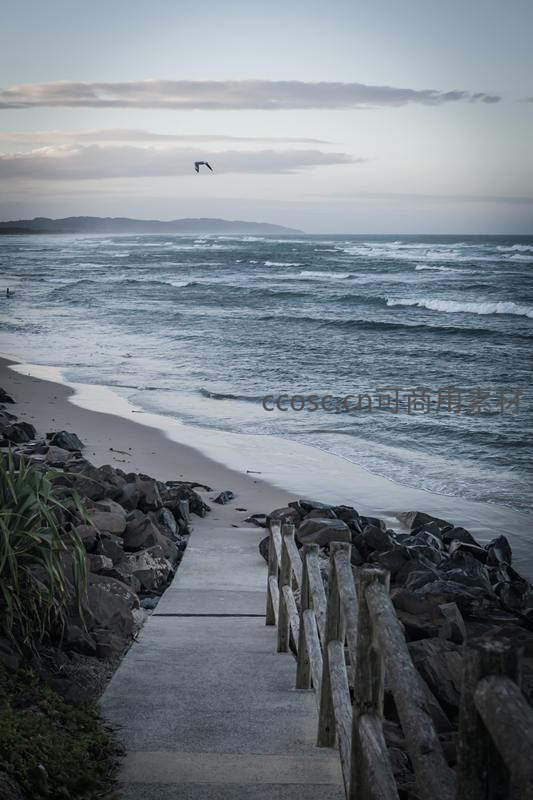 一条混凝土小径沿着布满岩石的海岸延伸,海浪轻拍沙滩,一只海鸥在暮色天空中飞翔,远处山峦隐约可见。