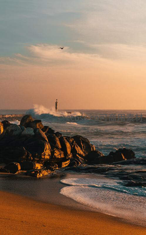 金色夕阳下,一座孤独的灯塔伫立在波涛汹涌的海面上,巨大的海浪拍打着岸边的黑色礁石,一只海鸥划过天际。