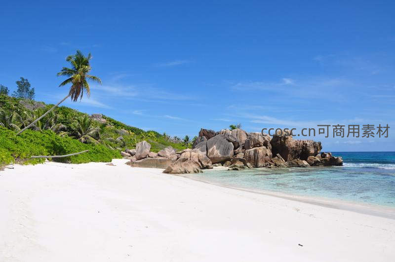 洁白细腻的沙滩延伸至蔚蓝大海,岸边矗立着巨大花岗岩,倾斜的椰树与翠绿植被点缀其间,构成一幅宁静的热带天堂画卷。