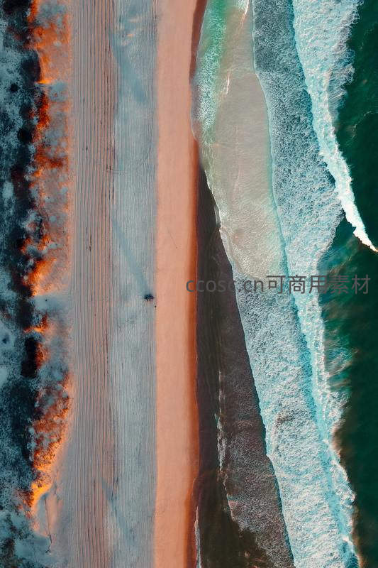 从高空俯瞰,金色沙滩与碧绿海浪形成鲜明对比,层层叠叠的浪花如丝带般蜿蜒,光影交错间展现大自然鬼斧神工的几何美感。