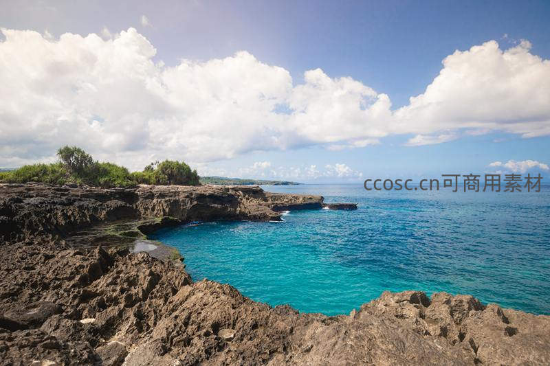 崎岖不平的黑色火山岩构成天然海岸线,怀抱一汪宝石蓝的清澈海水,头顶是棉花糖般的朵朵白云,展现出原始粗犷与纯净秀美的和谐统一。