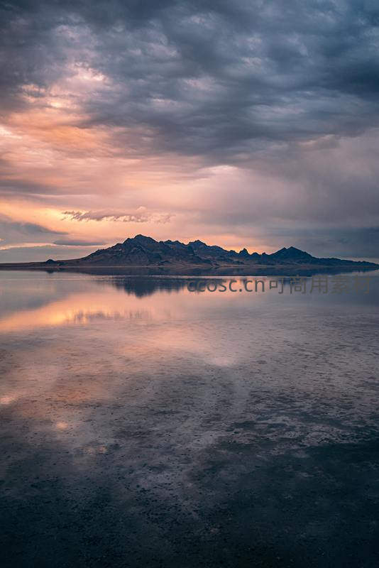 平静如镜的湖面完美倒映着远处的山峦和绚丽的晚霞天空,云层厚重,色彩斑斓,构成一幅壮丽的自然画卷。