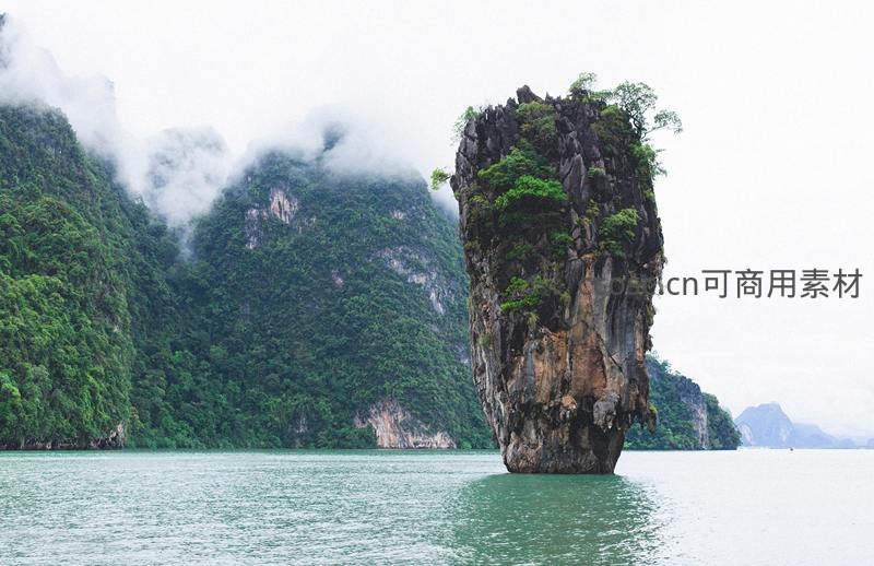 一座被茂密绿植覆盖的奇特岩石岛屿矗立在碧波之上,背景是云雾缭绕的青山,宛如人间仙境般的自然奇观。