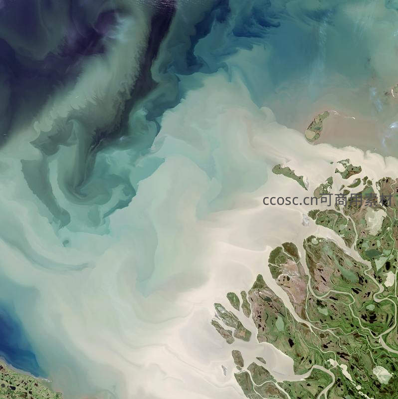 从高空俯瞰,海洋中巨大的蓝绿色漩涡与浅色泥沙交织,形成抽象的自然纹理,旁边是蜿蜒的海岸与绿色陆地。