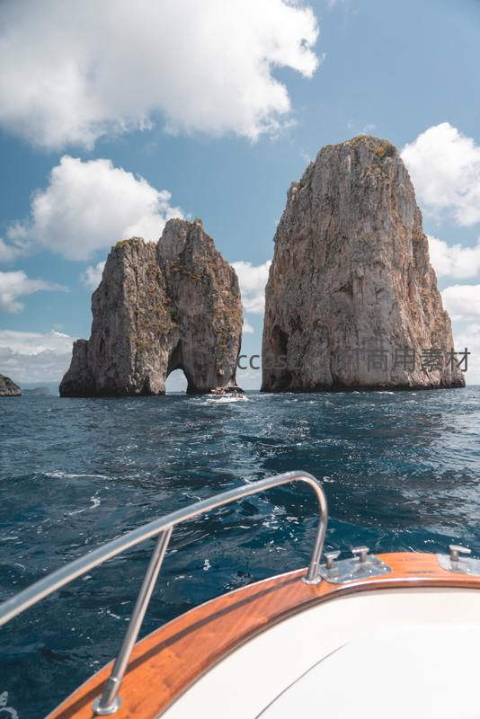 从游艇前端望去,蔚蓝海面上矗立着两座巨大而奇特的岩石,其中一座拥有天然形成的拱形洞穴,景色壮丽非凡。