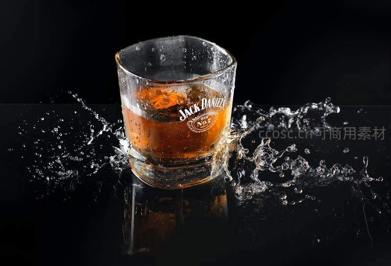 深色背景下,一杯琥珀色杰克丹尼威士忌置于光滑台面,冰块撞击杯壁,水花四溅,光影折射尽显高级质感。