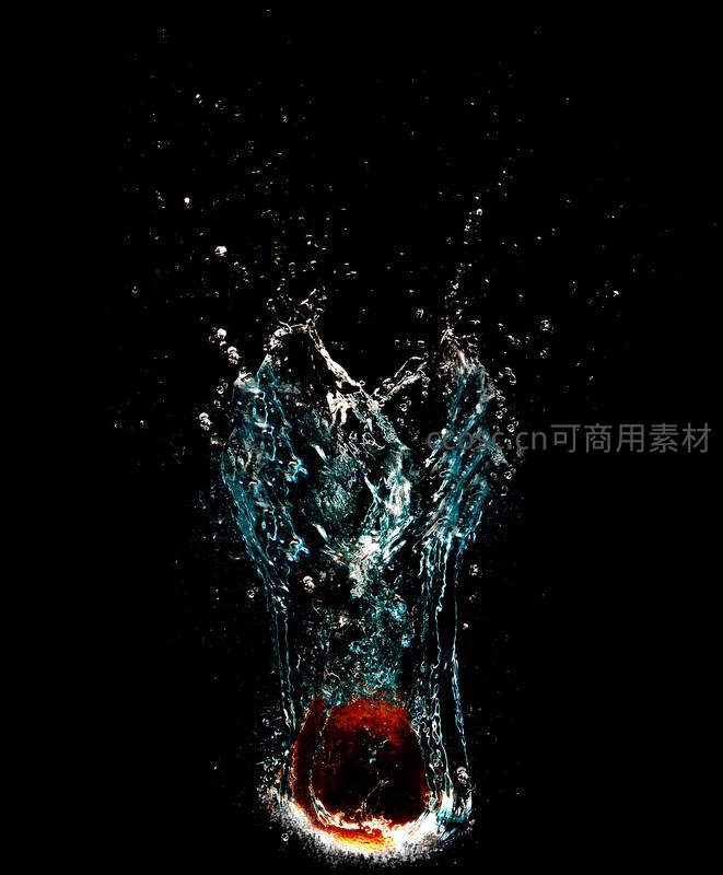 一颗红色水果坠入水中,在纯黑背景下激起绚丽的蓝色水花,瞬间凝固,展现力量与美感的结合。