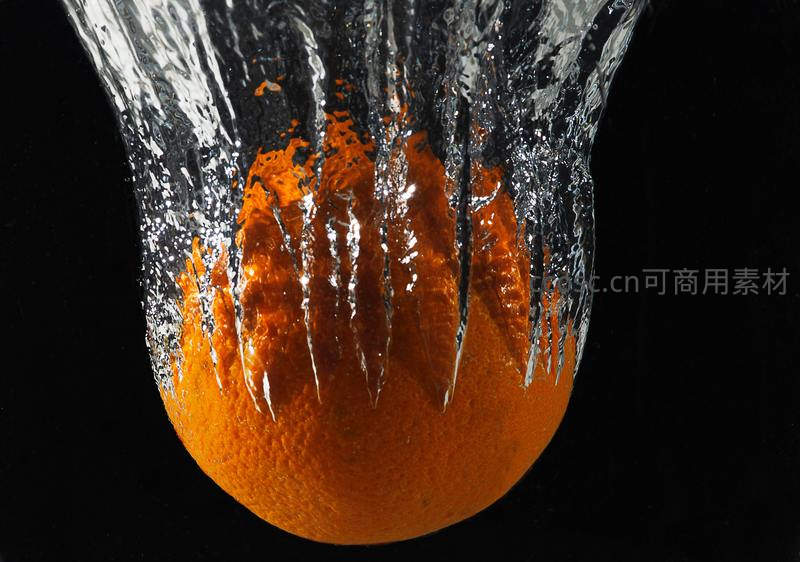 一颗饱满的橙子被高速水流猛烈冲击,水珠四散,橙皮纹理清晰可见,呈现强烈的视觉冲击力。