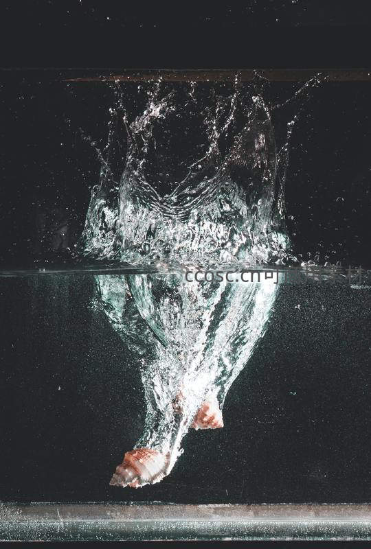一枚贝壳高速坠入水中,在黑色背景下激起壮观的水花,水面倒影与飞溅水珠构成戏剧性画面。