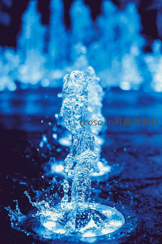 在深蓝色调下,一束喷泉的水柱向上喷涌,水珠四溅,背景虚化处理,突显了水流的力量感与清凉的夏日氛围。