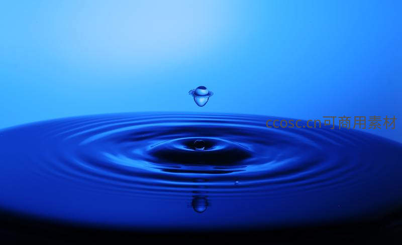 一颗水滴悬停在深蓝色水面之上,即将落下,水面已泛起层层同心圆波纹,整个画面充满宁静、精确与诗意的美感。