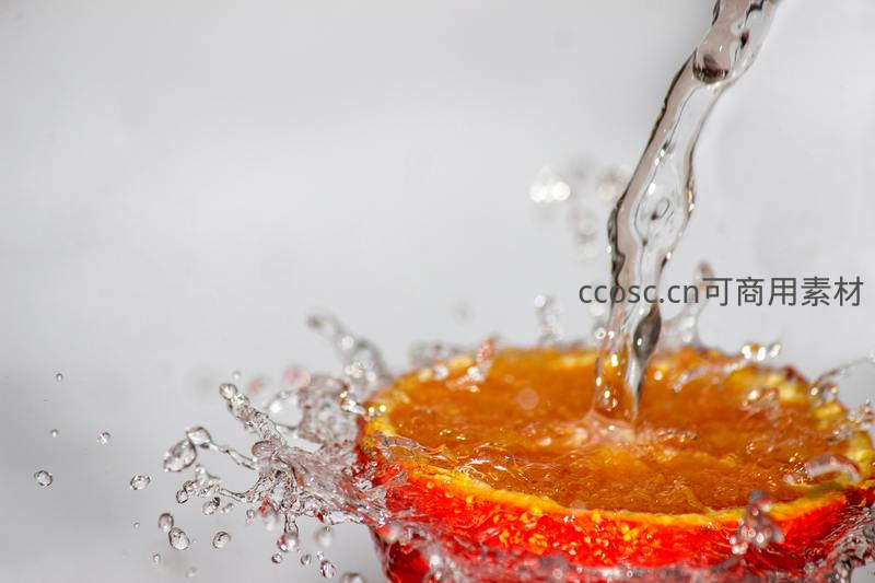清澈水流倾泻而下,猛烈冲击半颗橙子,瞬间激起无数晶莹剔透的水珠与浪花,充满动感与活力。